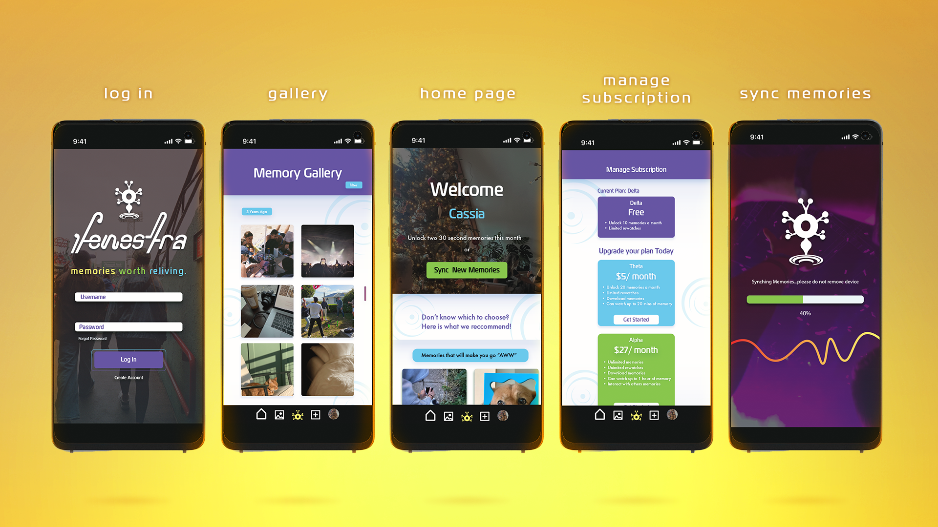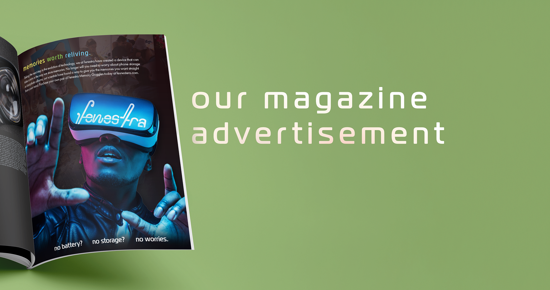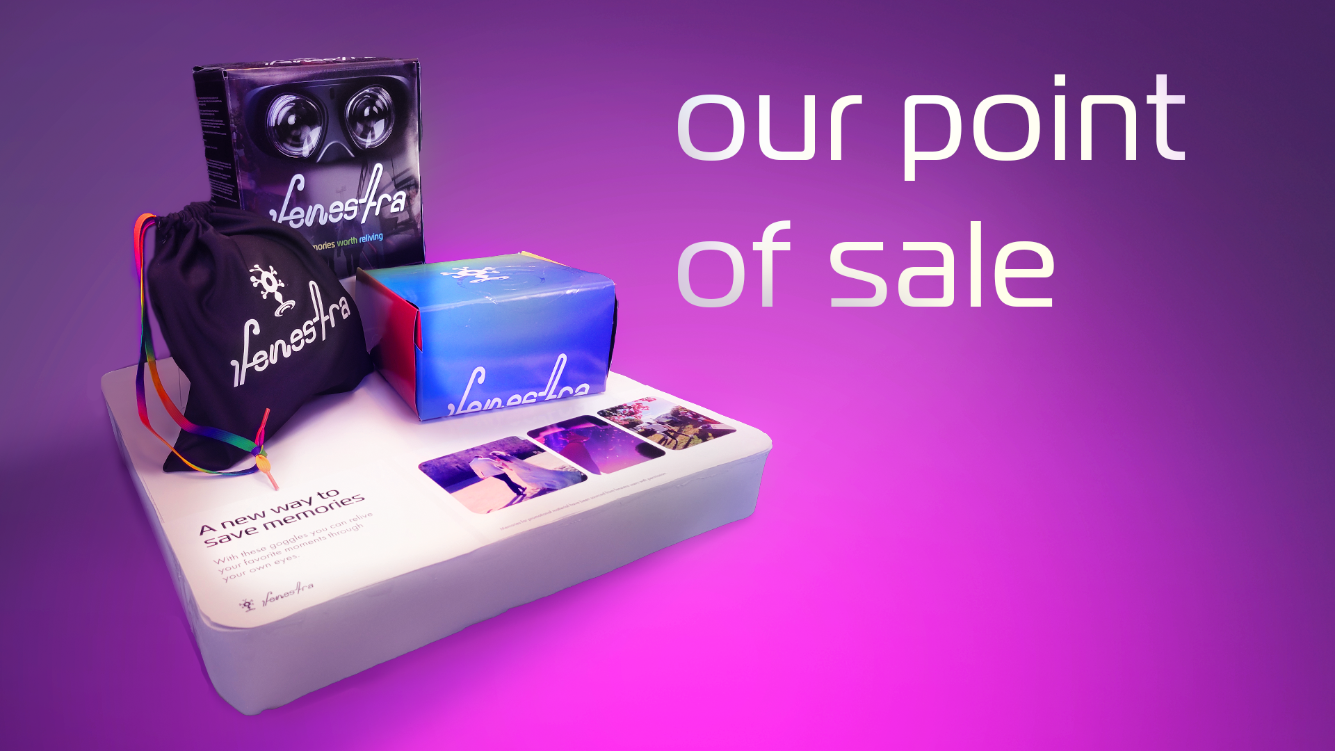 Fenestra is a fictional product inspired by science fiction series such as Black Mirror and Severance. The idea of this product stems from the issue of people becoming obsessed with needing to capture every moment on their phone for the fear of not being able to share with friends or remember something later. So, why should your memories come from the phone's perspective? Not only do these goggles easily send your memories to your phone, but you can slip them on and relive those moments from your own eyes as if you were there once again.