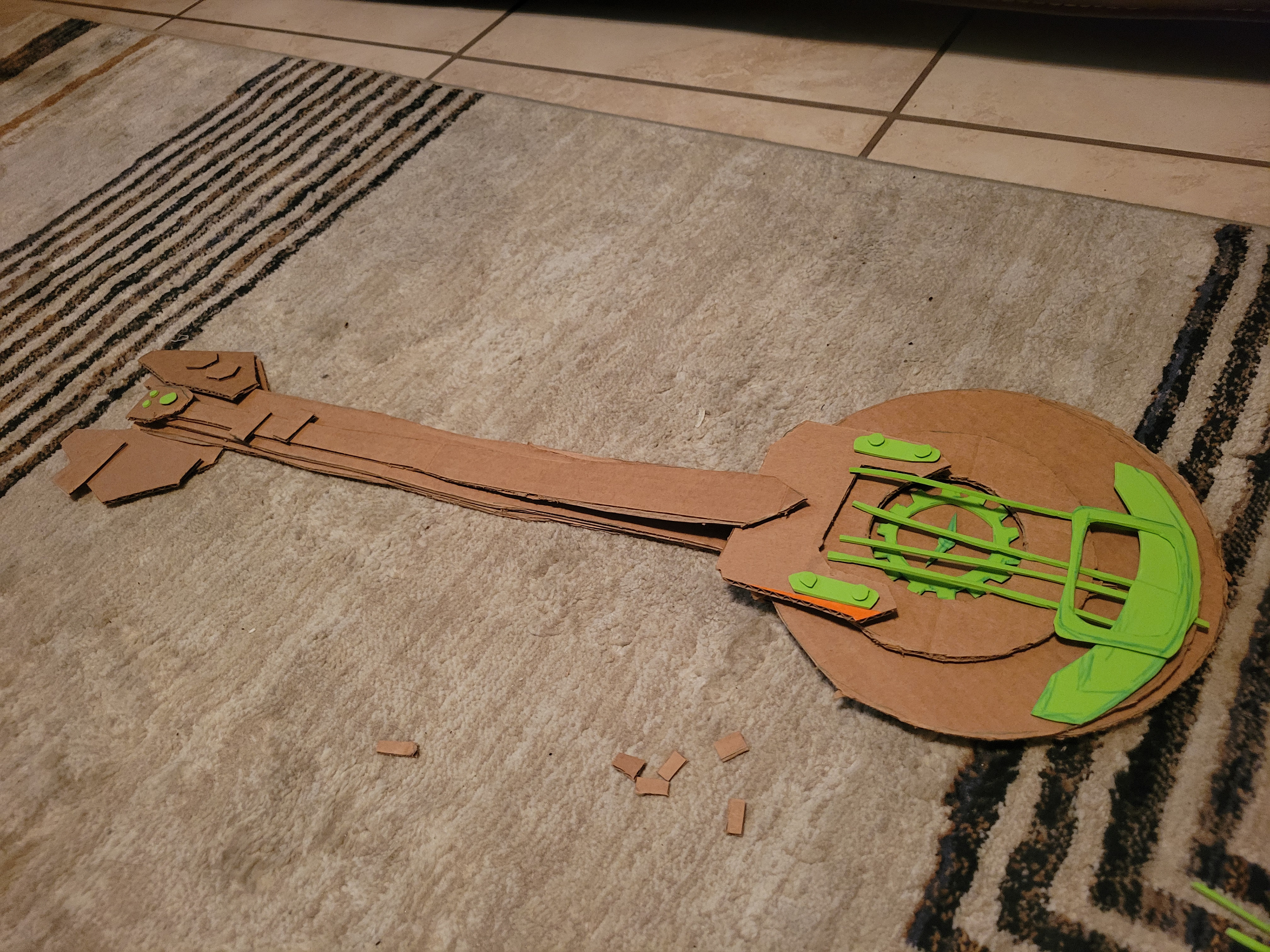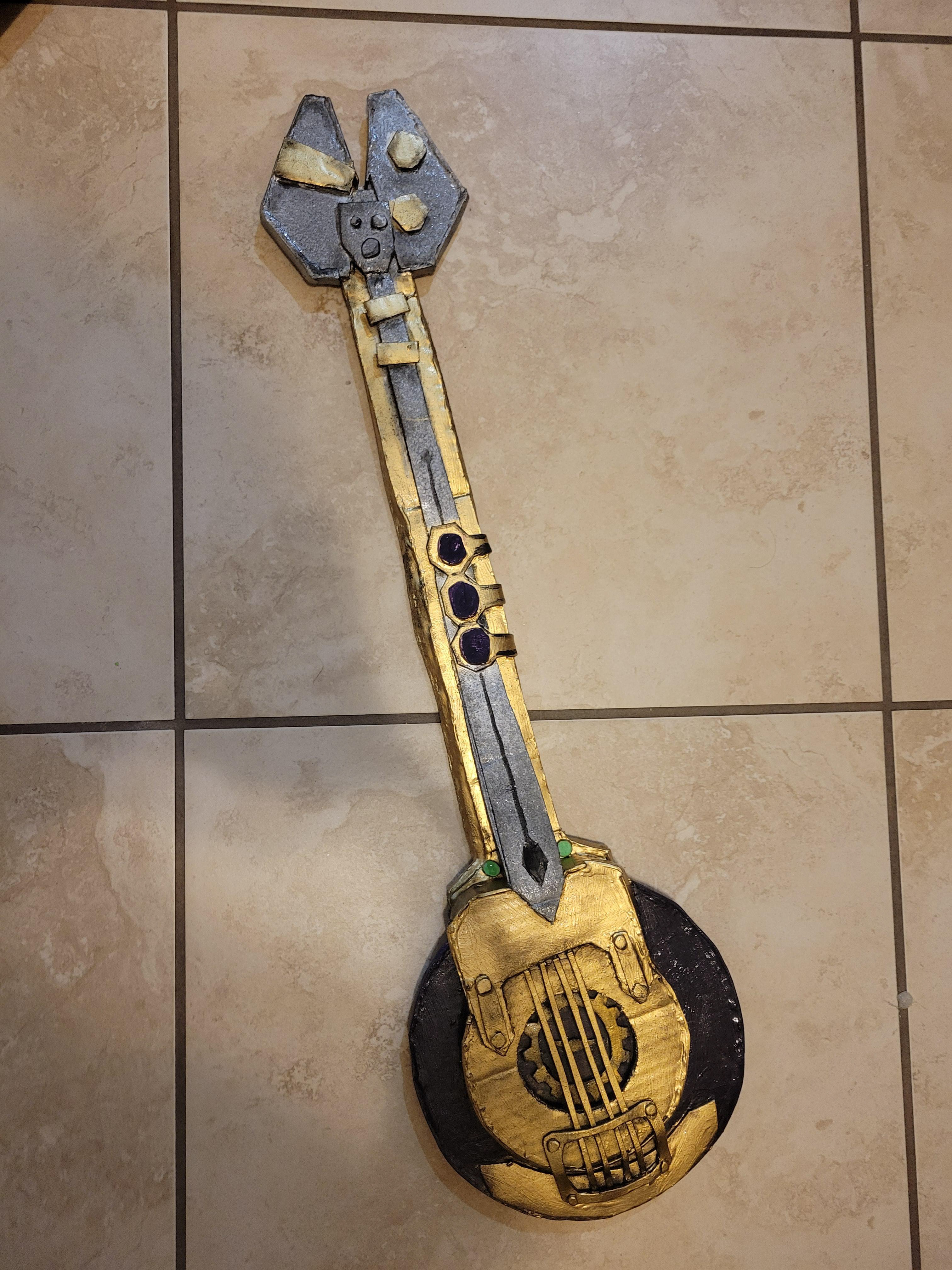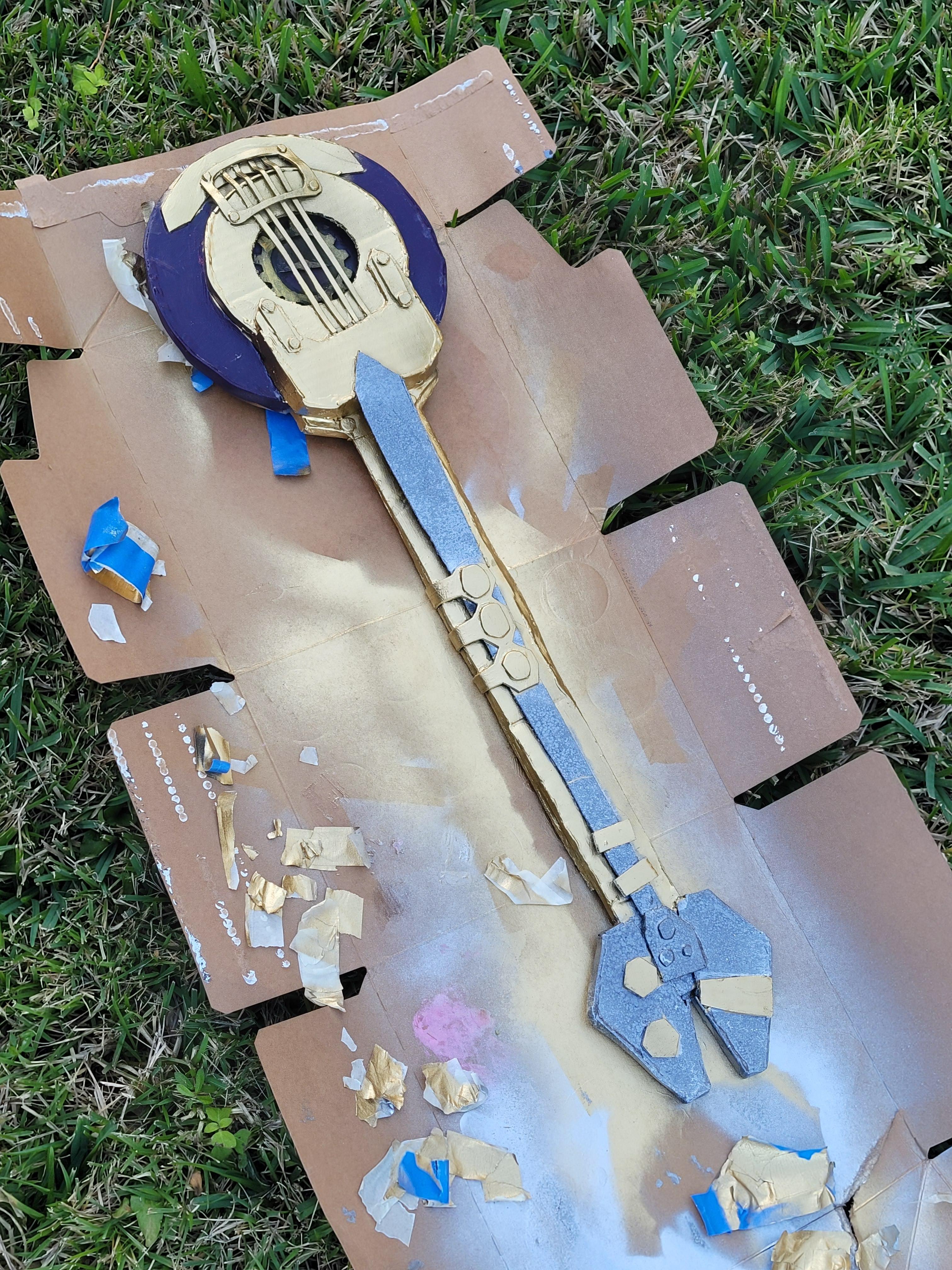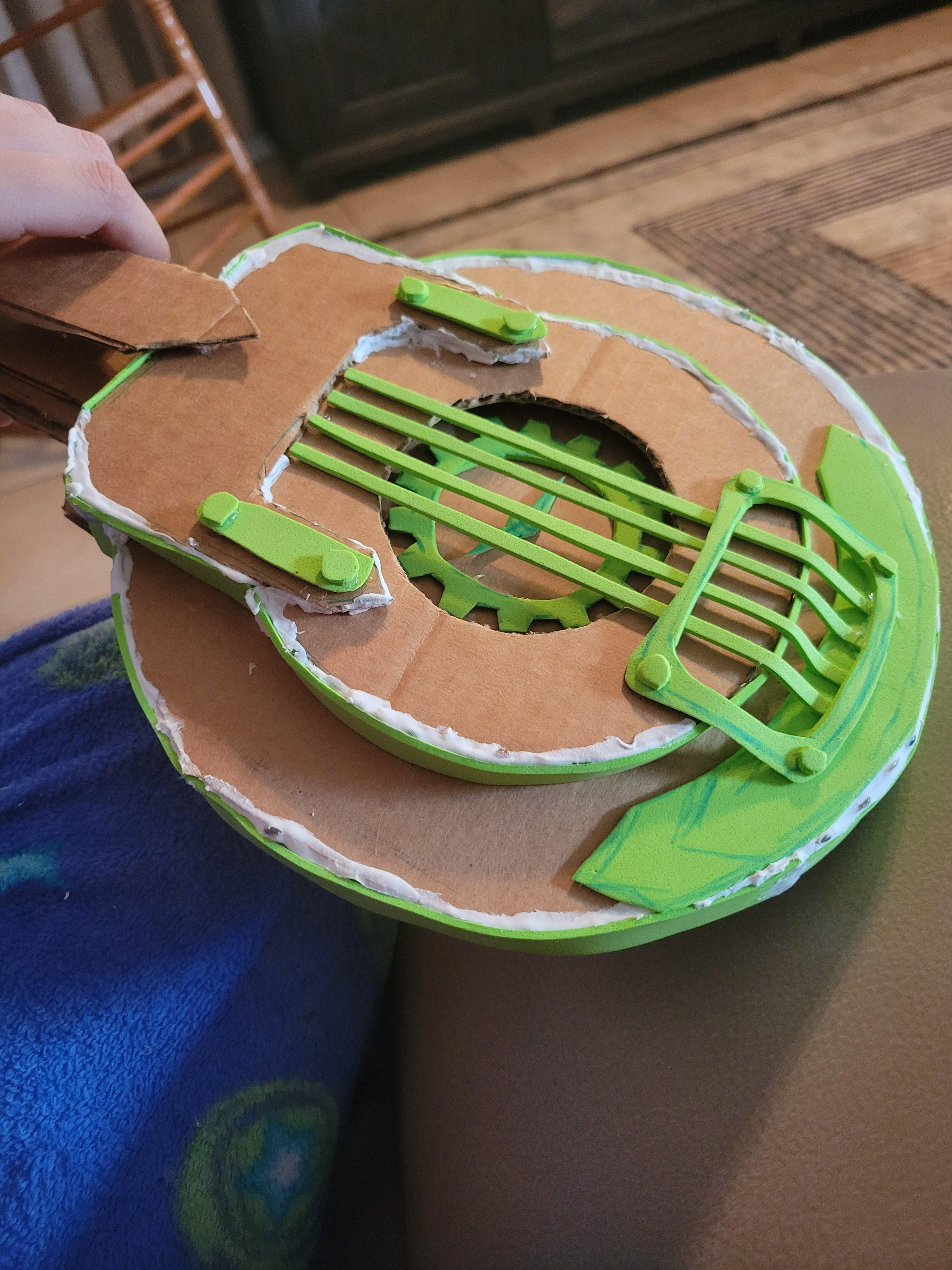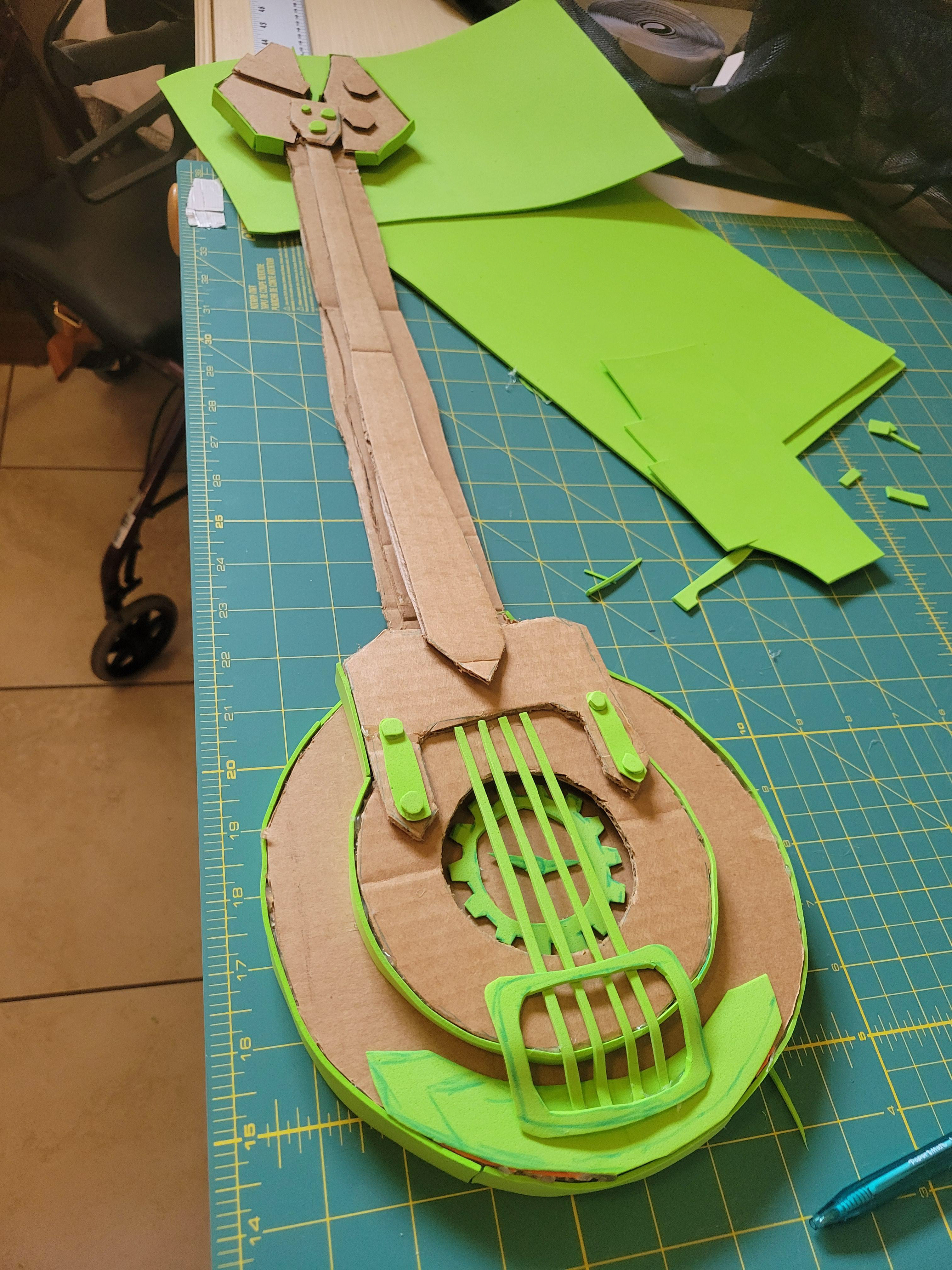 In December 2025, I had made the last-minute decision to create Heimerdinger's guitar from Arcane season 2. Not only did I give myself a week before the event to complete this build, but I challenged myself to only use materials that I already owned. I looked at several angles of the guitar in the show and referenced concept art to create a vector test in Adobe Illustrator to help me visualize how I could layer cardboard to create the final piece.